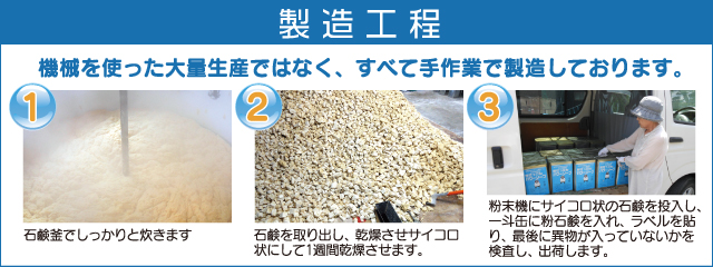食品由来の「油」と「苛性ソーダ」、熊本の豊富な「地下水」だけで造ります。