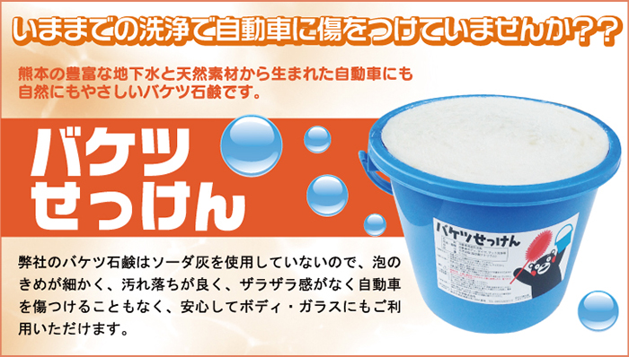 いままでの洗浄で自動車に傷をつけていませんか??弊社のバケツ石鹸はソーダ灰を使用していないので、ザラザラ感がなく自動車を傷つけることもなく、熊本の豊富な地下水と天然素材から生まれた自動車にも自然にもやさしいバケツ石鹸です。ザラザラ感がないので、安心してボディ・ガラスにもご利用いただけます。