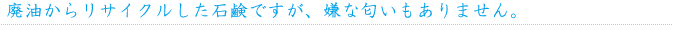 リサイクル石鹸と聞くと、廃油由来なので嫌な臭いがするようなイメージがあるかもしれませんが、弊社の石鹸は不快な匂いが発生しません。
