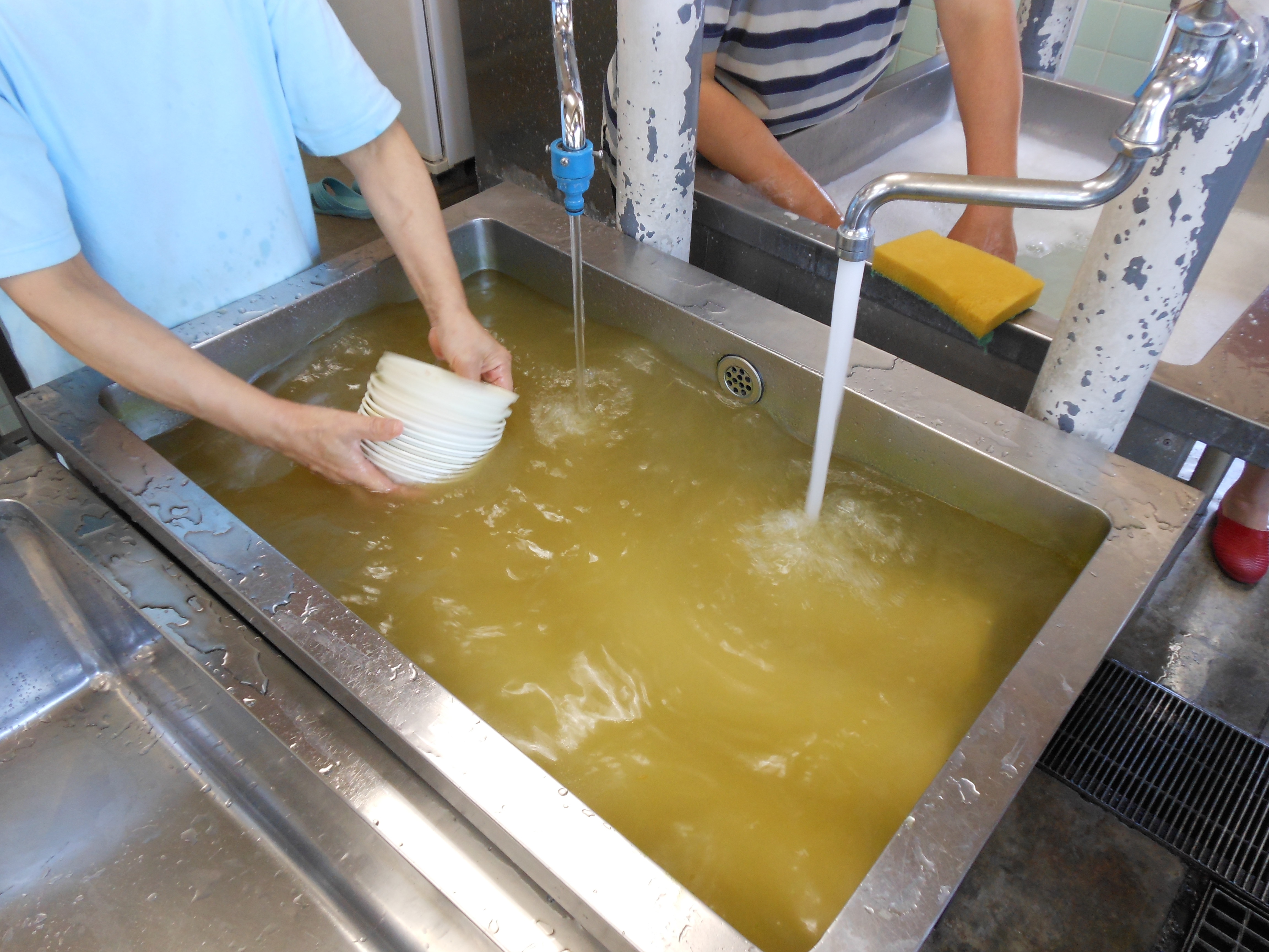 まず、食器に余分な食べ物かすや油汚れ(ソース、調味料等)を軽く手でそぎ落としてください。